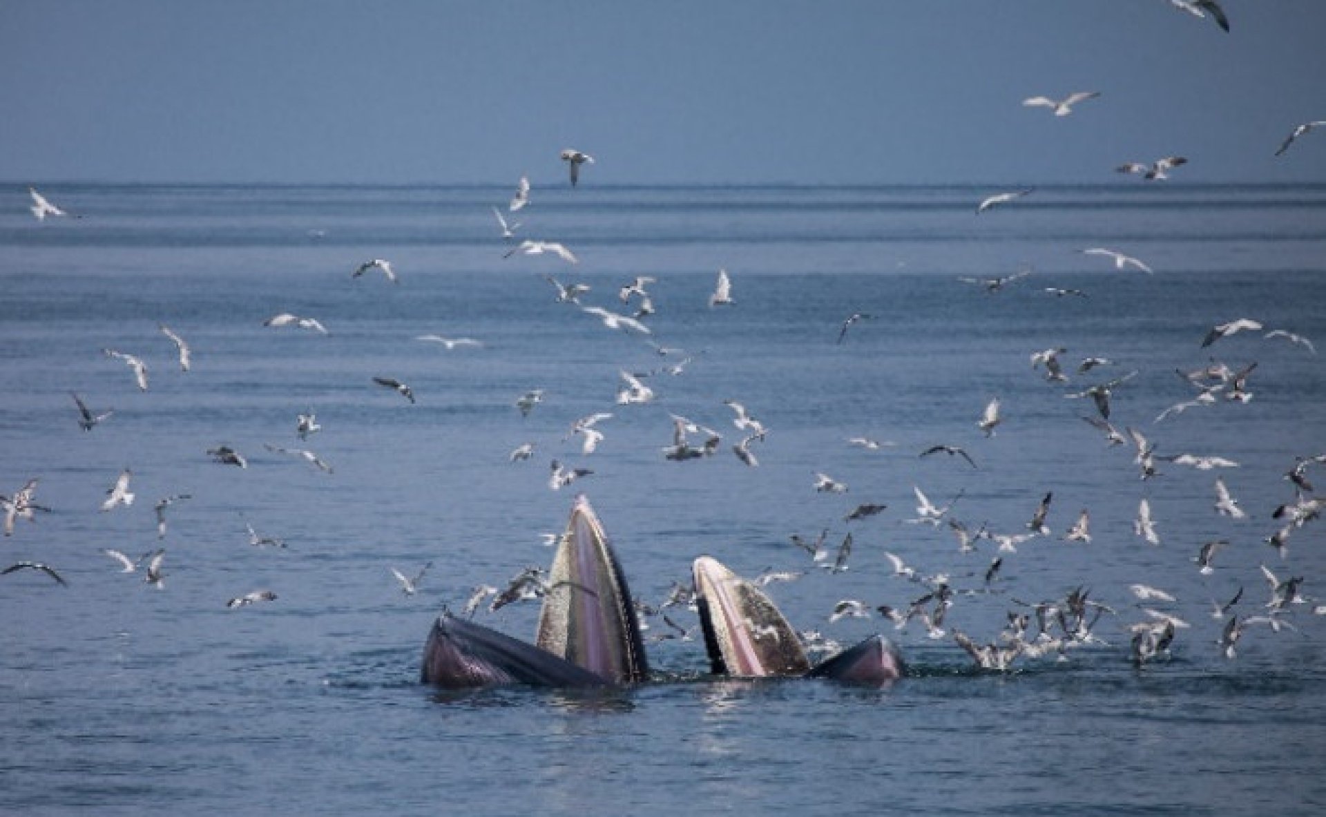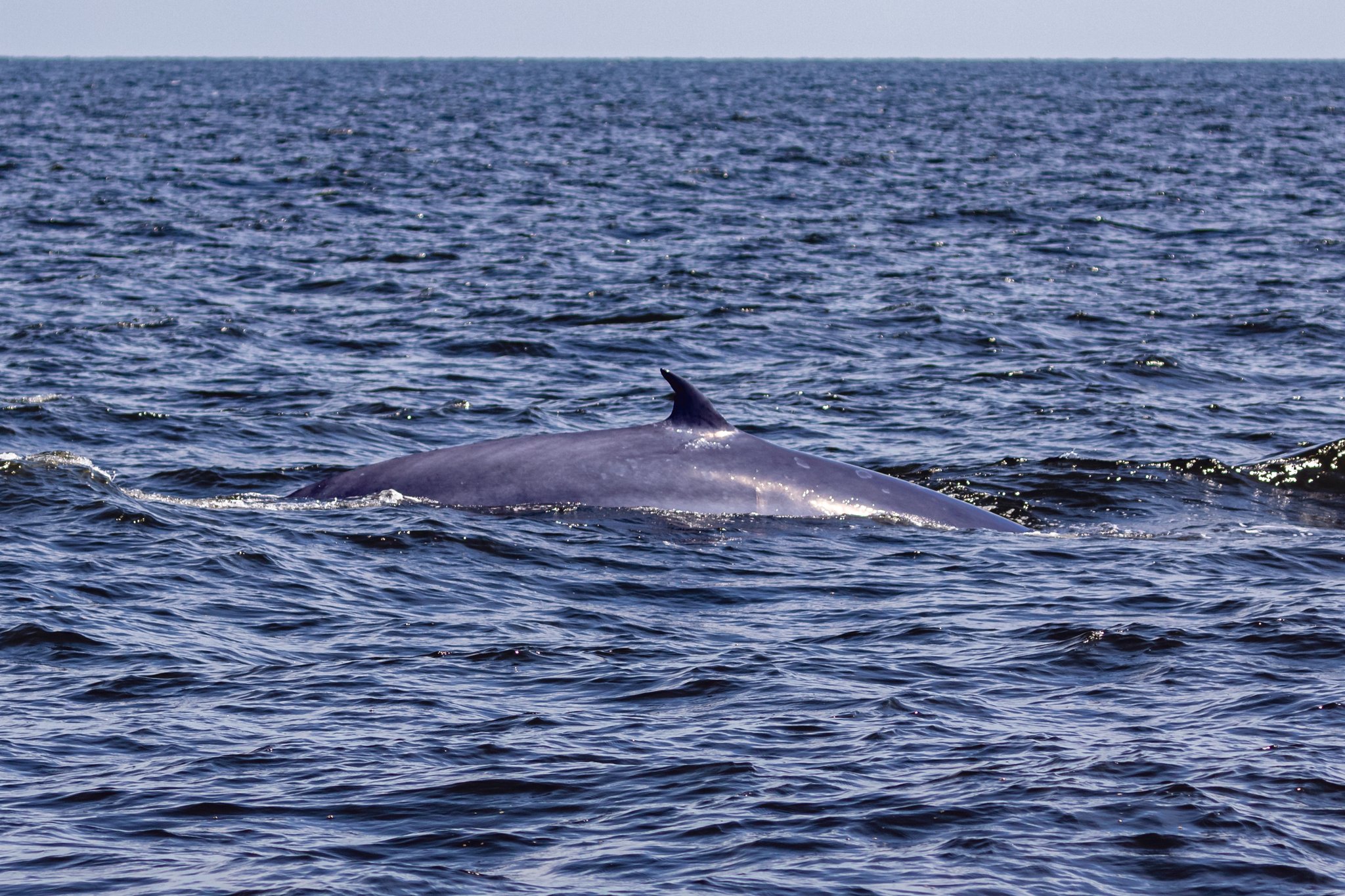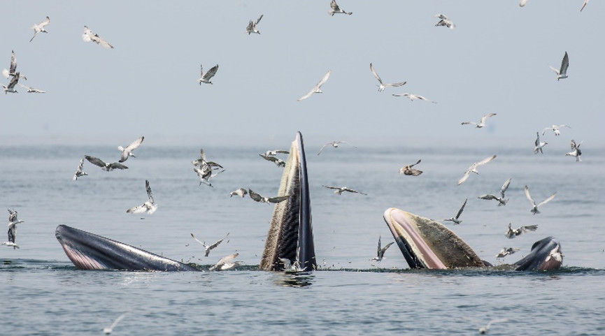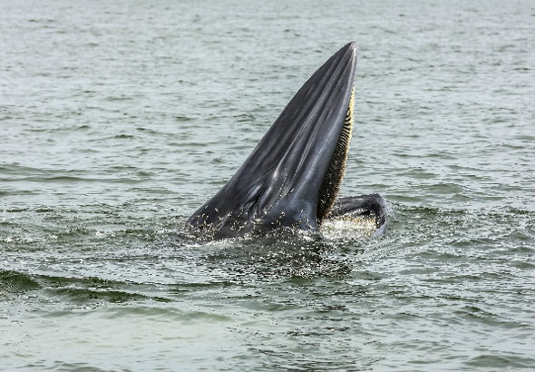 The upper part of the Gulf of Thailand, near the shores of Samut Sakhon and Phetburi provinces, is the habitat of 80 Brydes whales. It's thrilling to watch these whales feed on anchovies by opening their mouths as wide as possible, trapping a large quantity of anchovies carried by the current. The whales unique feeding style also benefits gulls with similar diets. It's a common sight to see large flocks of gulls closely following the whales to get their share of anchovies. The attached images were taken on my previous whale-watching trips for comparison with the image from my most recent trip on Nov. 16, 2023, during which none of the three whales I spotted displayed their spectacular feeding due to the unsettled sea. Only one whales dorsal fin was visible.