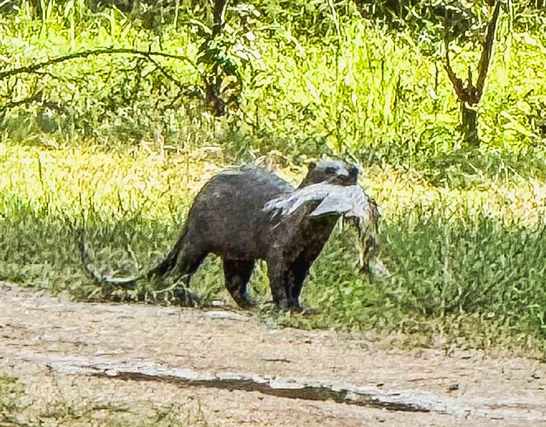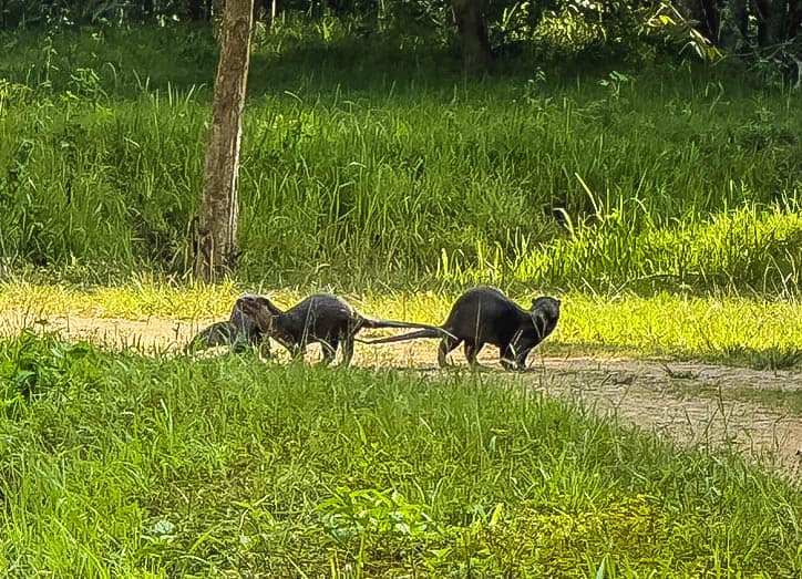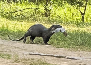 It was an exciting 2-day trip to Khao Yai National Park. The excitement began on the first afternoon while we were on our way to see gaurs in their habitat at Wang Nam Kheo, part of the national park. Suddenly we spotted one smooth-coated otter coming up from a lake near the road so we parked our car on the roadside to see what would happen next. A few minutes later 4 more otters emerged from the water and joined the first otter on the shore. It was thrilling to see one of them carrying a large fish in its mouth and crossed a local dirt road heading to a nearby forest followed by the four members of its family. I was delighted to catch their movement with my iphone especially the one with the fish in its mouth. It was my first sighting of the smooth-coated otter, not one but five otters!